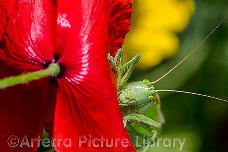 Subject: Great green bush-cricket (Tettigonia viridissima) adult female / imago on red flower of common poppy (Papaver rhoeas) in meadow in summer